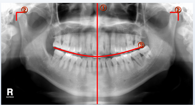 - 하악 전치부 부위가 부분적으로 확대된 영상은 고개가 숙인 경우 발생(일명 V자 영상)