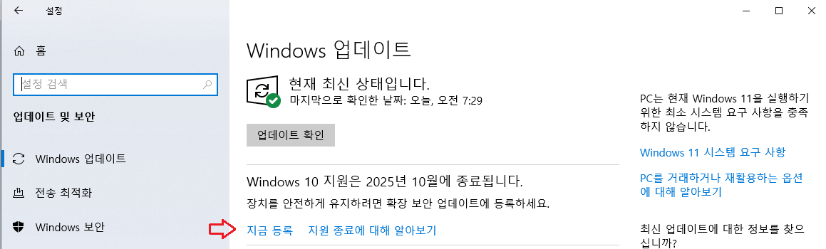 - 설정 > 업데이트 및 보안 > Windows 업데이트로 이동합니다. 디바이스가 필수 전제 조건을 충족하는 경우 ESU에 등록할 수 있는 링크가 표시됩니다.