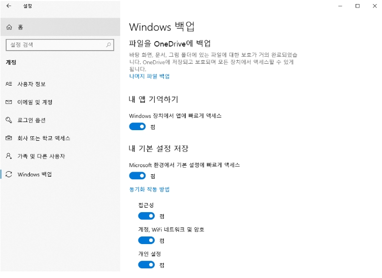 - 설정 > 계정 > Windows 백업 켜기를 활성화 합니다.